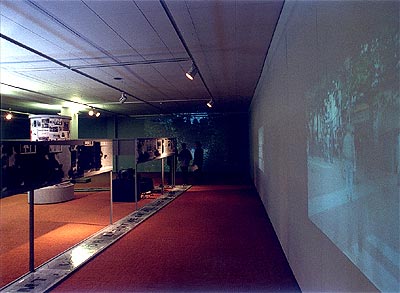 Schatten 9/9 Großbildprojektionen 4 Großbildprojektionen in vier verschiedenen Geschwindigkeiten Bewegung - Oberfläche - Erinnerung - Landschaftsaufnahmen aus dem Konzentrationslager Hamburg-Neuengamme. -Menschen in der Stadt, drei Plätze.
